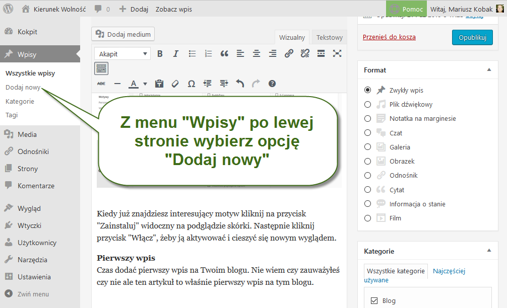 Czas dodać pierwszy wpis na Twoim blogu. Nie wiem czy zauważyłeś czy nie ale ten artykuł to właśnie pierwszy wpis na tym blogu. Aby dodać pierwszy wpis wybierz z menu „Wpisy” po lewej stronie opcję „Dodaj nowy”. W ten sposób uruchomisz edytor WYSIWYG tekstu gdzie będziesz mógł stworzyć treść swojego pierwszego wpisu. Gdy już skończysz naciśnij przycisk „Opublikuj”. To takie proste!