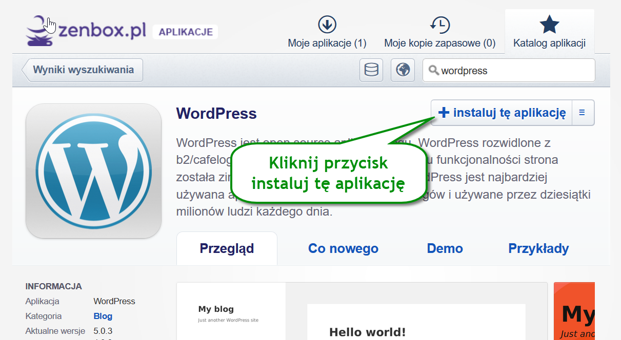 Dodatkowo ZenBox.pl w swoim panelu ma instalator WordPress’s. Samodzielnie można zainstalować CMS’a w 10 sekund bez specjalistycznej wiedzy informatycznej.