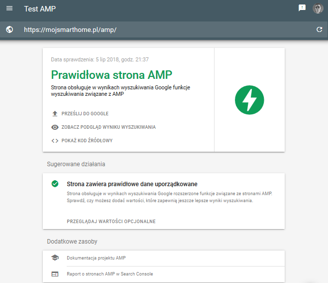 Gdy już aktywujesz wtyczkę na swojej stronie możesz przetestować w narzędziu Google AMP Test czy Twoja strona spełnia standard. Wynik powinien wyglądać tak jak na poniższym screenie. Jeśli wszystko będzie OK, kliknij link PRZEŚLIJ DO GOOGLE.