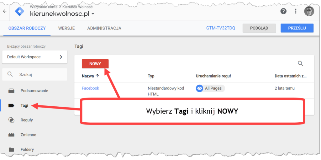 W menu po lewej stronie kliknij w opcję Tagi a następnie w przycisk NOWY.