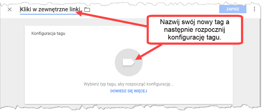 Możesz nadać dowolną nazwę dla swojego nowego taga. Ja wpisałem Kliki w zewnętrzne linki. Jeśli chcesz możesz wpisać taką samą nazwę u siebie. Następnie wybierz typ tagu, żeby rozpocząć jego konfigurację.