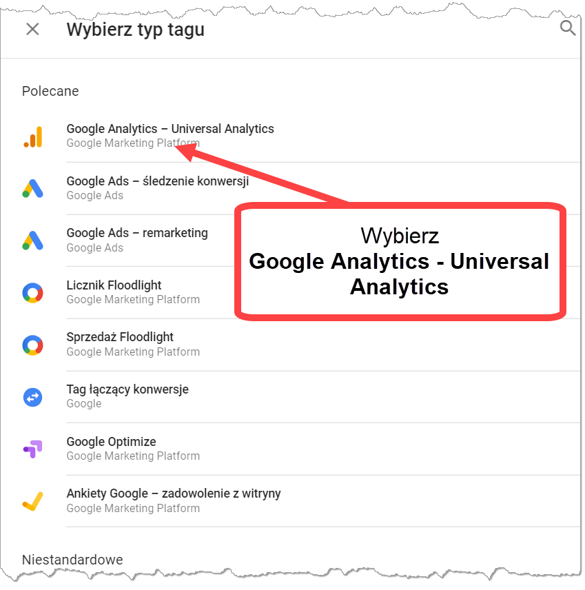 W tym kroku wybierz Google Analytics – Universal Analytics.