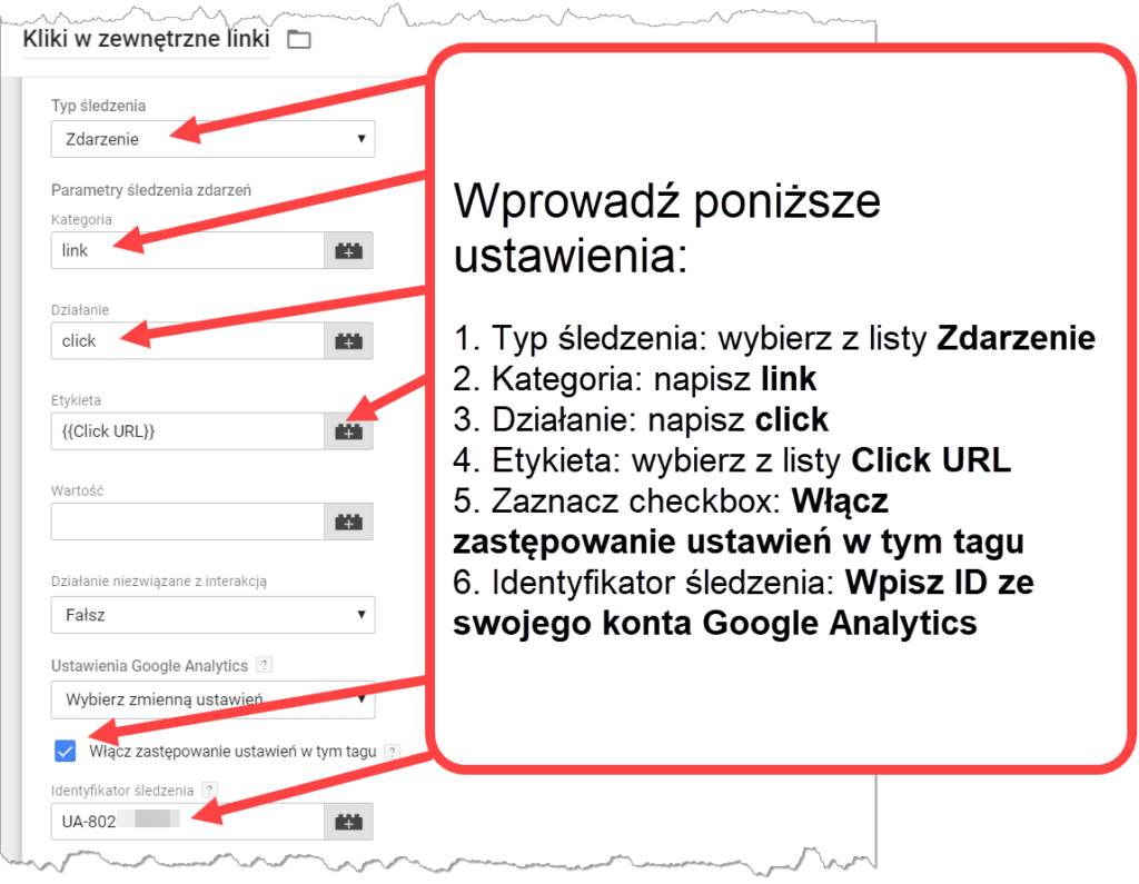 Pod polem Ustawienia Google Analytics jest checkbox Włącz zastępowanie ustawień w tym tagu. Zaznacz go. W polu Identyfikator śledzenia wpisz ID swojego konta Google Analytics. Jeśli nie wiesz gdzie je odszukać napisz mi o tym w komentarzu pod tym wpisem a chętnie Ci pomogę.