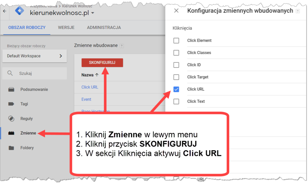 Teraz kliknij w opcję Zmienne w menu po lewej stronie. Następnie kliknij w czerwony przycisk SKONFIGURUJ w sekcji ze zmiennymi wbudowanymi.