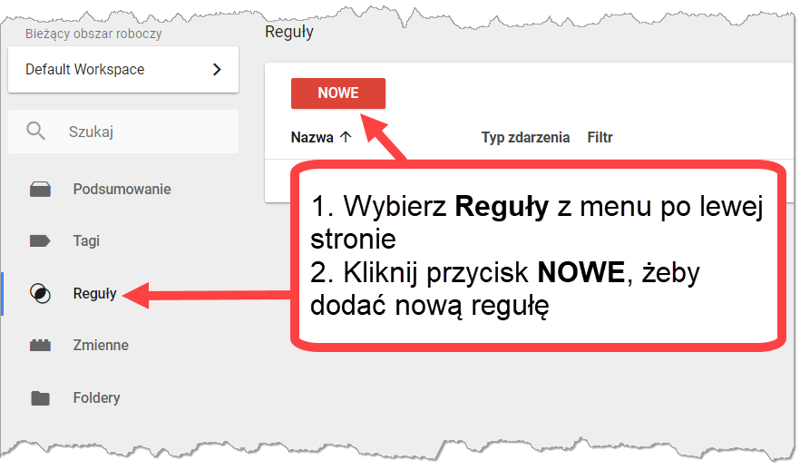 Dodaj regułę powiązaną ze stworzonym wcześniej tagiem. W tym celu w menu po lewej stronie kliknij w Reguły. Następnie w przycisk NOWE.
