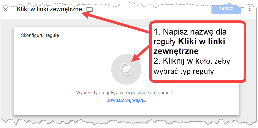 Nadaj nazwę nowej regule. Możesz wpisać to co ja czyli Kliki z linki zewnętrzne. Następnie kliknij w okrągły przycisk, żeby rozpocząć konfigurację.