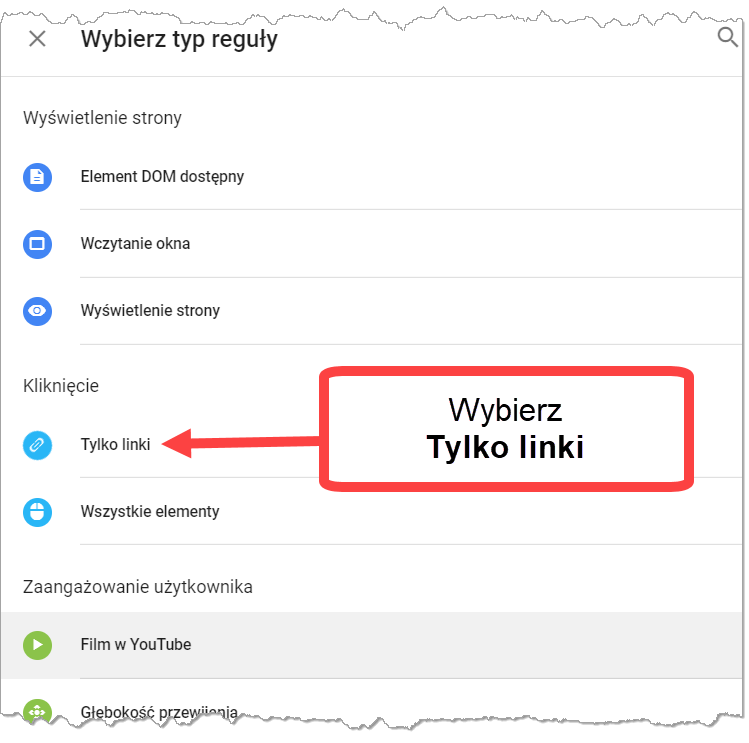 Jako typ reguły w sekcji Kliknięcia wybierz Tylko linki.