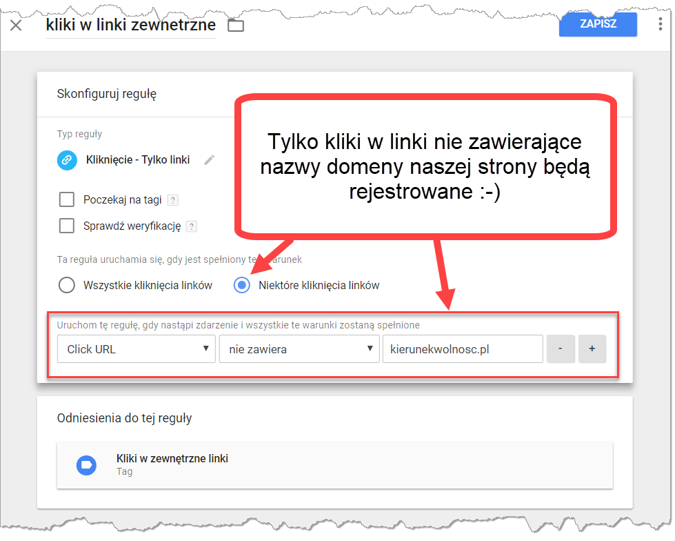 Chcesz śledzić kliki tylko w zewnętrzne linki dlatego wybierz opcję Niektóre kliknięcia linków. Potem ustaw taki warunek: