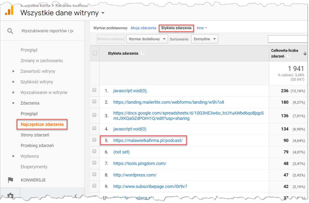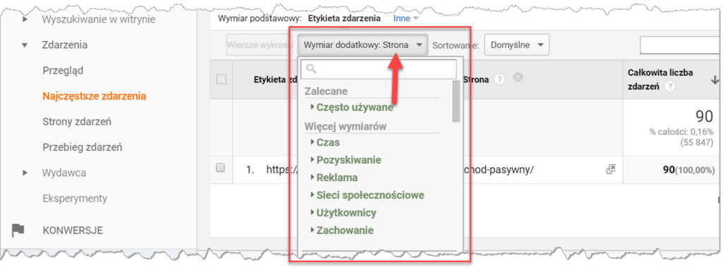 Aby się dokładnie dowiedzieć do jakich stron prowadzą linki wystarczy w sekcji Wymiar podstawowy wybrać Etykiety Zdarzeń. Teraz zobaczysz dokładne URLe do stron, na które kierujesz ruch ze swojego bloga.