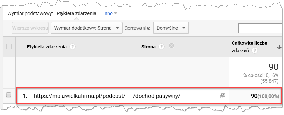 Wystarczy, że kliknę w Wymiar dodatkowy i wybiorę interesującą mnie opcję. W moim przypadku chcę się dowiedzieć na jakiej stronie moi czytelnicy klikają w link do podcastu Mała Wielka Firma więc jako wymiar dodatkowy wybrałem Strona.